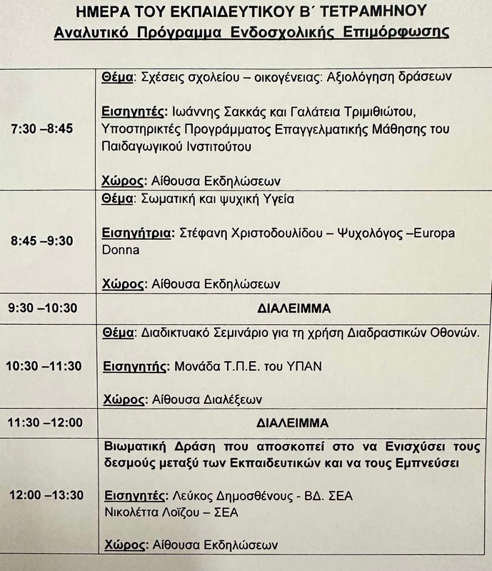 Ημέρα Εκπαιδευτικού χθες στο πλαίσιο του Β΄ τετραμήνου, με κεντρικό άξονα τις σχέσεις σχολείου – οικογένειας και την αξιολόγηση δράσεων.