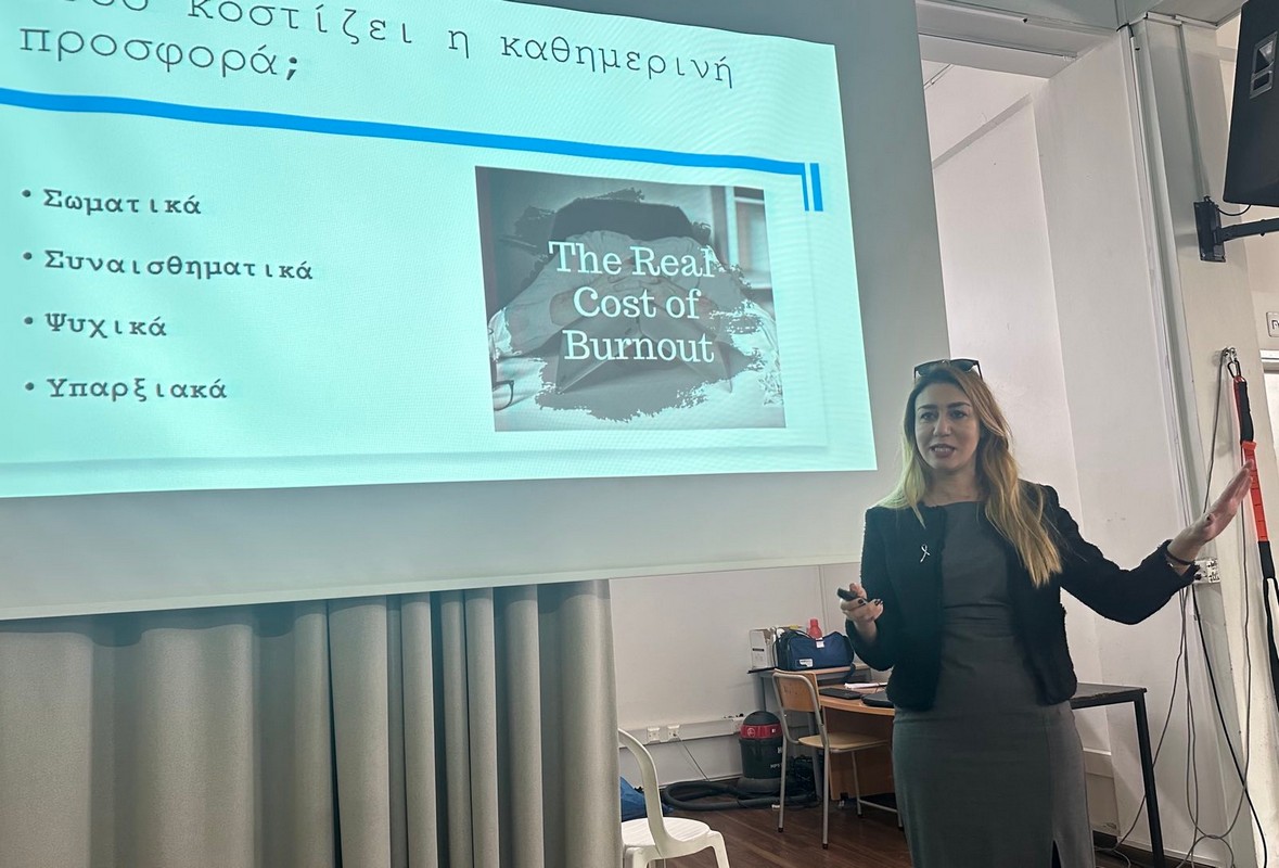 Στη συνέχεια, η κ. Στέφανη Χριστοδουλίδου, Ψυχολόγος του οργανισμού Europa Donna, ανέπτυξε το θέμα της εργασιακής εξουθένωσης, υπογραμμίζοντας τη σημασία της φροντίδας της σωματικής και ψυχικής υγείας στην εκπαιδευτική κοινότητα.